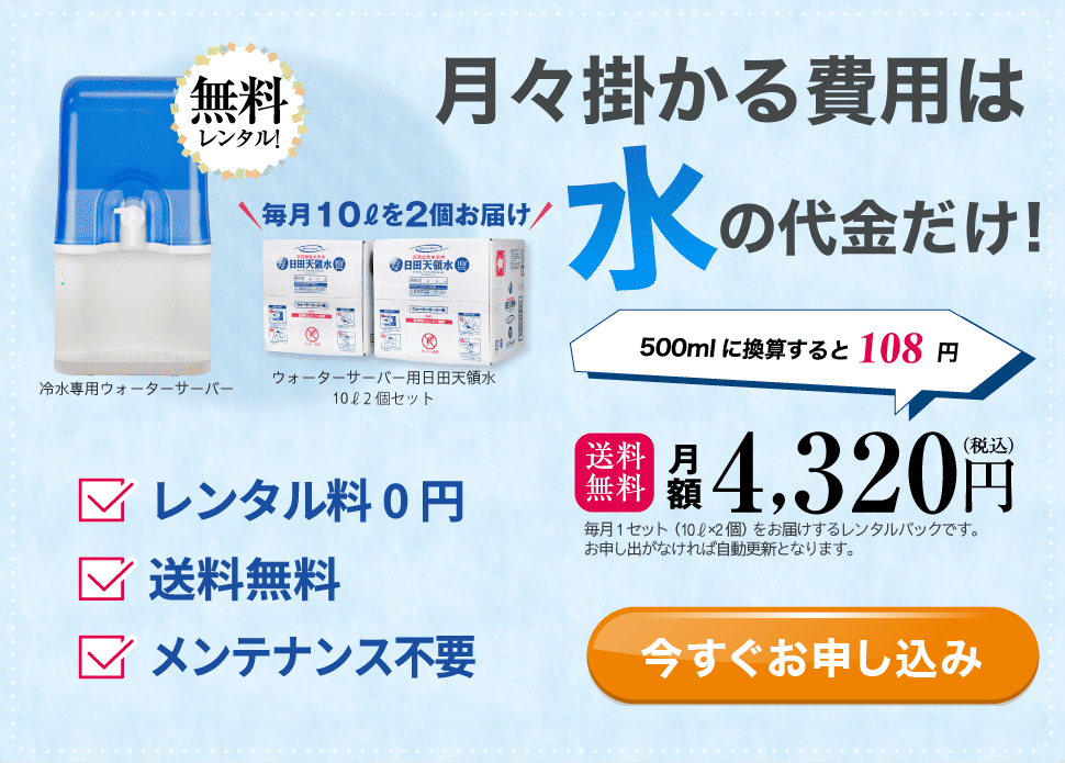 メンテナンスは簡単で、サーバーメンテナンス料・レンタル料・配送料がゼロ、水のお代だけで利用可能です。