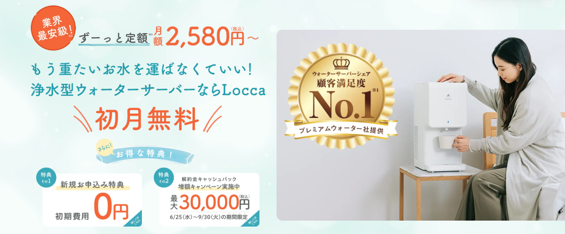 Locca(ロッカ)は、水道水を高性能フィルターで浄化し、いつでも好きなだけ美味しいお水が使える浄水型ウォーターサーバーです。